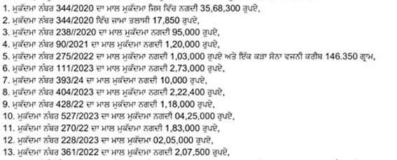 ਥਾਣਾ ਸਿਟੀ 1 ਬਰਨਾਲਾ ਵਿਖੇ ਮਿਤੀ 1/8/2025 ਨੂੰ ਦਰਜ ਐਫਆਈਆਰ ਅਨੁਸਾਰ, ਅਫਸਰ ਇਚਾਰਜ ਥਾਣਾ ਸਿਟੀ 1 ਬਰਨਾਲਾ ਅਤੇ ਸ:ਥ ਅਵਤਾਰ ਸਿੰਘ ,ਹਰਪ੍ਰੀਤ ਸਿੰਘ ,ਮਹਿਲਾ ਸੀਨੀ: ਸਿਪਾਹੀ: ਹਰਦੀਪ ਕੌਰ ਅਤੇ ਸਿਪਾਹੀ ਗੁਰਸੇਵਕ ਸਿੰਘ ਦੇ ਹਾਜਰ ਥਾਣਾ ਸੀ ਤਾਂ ਸ:ਥਾਣੇਦਾਰ ਰਣਜੀਤ ਸਿੰਘ ਇੰਚਾਰਜ ਮਾਲਖਾਨਾ ਥਾਣਾ ਸਿਟੀ ਬਰਨਾਲਾ ਰਾਂਹੀ ਥਾਣੇ ਦੇ ਮਾਲਖਾਨਾ ਦੀ ਚੈਕਿੰਗ ਕੀਤੀ ਗਈ, ਜੋ ਚੈਕਿੰਗ ਕਰਨ ਤੋਂ 13 ਕੇਸਾਂ ਵਿੱਚ ਮਾਲ ਮੁਕੱਦਮਾ ਘੱਟ ਹੋਣਾ ਪਾਇਆ ਗਿਆ। ਸਭ ਤੋਂ ਜਿਆਦਾ ਨਗਦੀ ਐਫਆਈਆਰ ਨੰਬਰ 344/2020 ਦੇ ਮਾਲ ਮੁਕੱਦਮਾਂ ਵਿੱਚ 35,68,300 ਰੁਪਏ ਸ਼ਾਮਿਲ ਹੈ। ਇੱਨ੍ਹਾਂ ਕੇਸਾਂ ਵਿੱਚ ਮਾਲ ਮੁਕੱਦਮਾਂ ਦਾ ਵੇਰਵਾ ਹੇਠ ਲਿਖੇ ਮੁਤਾਬਿਕ ਹੈ:-