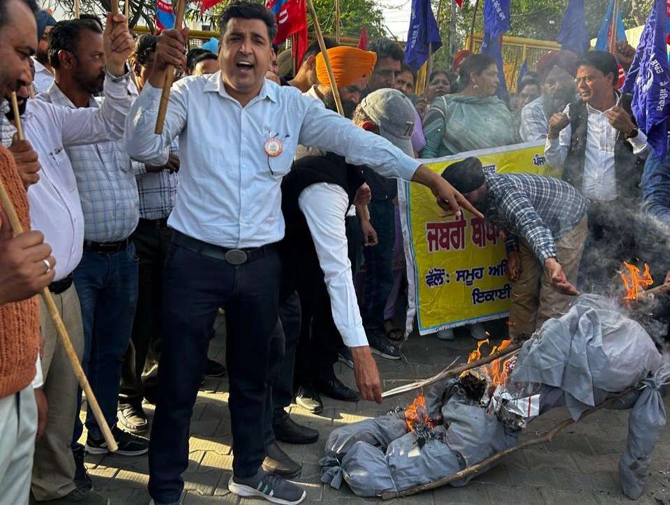 ਪੰਜਾਬ ਦੀਆਂ ਸਮੂਹ ਅਧਿਆਪਕ ਜਥੇਬੰਦੀਆਂ ਨੇ ਅੱਜ ਬਰਨਾਲਾ ਦੀਆਂ ਸੜਕਾਂ ‘ਤੇ ਪੰਜਾਬ ਸਰਕਾਰ ਵਿਰੁੱਧ ਜ਼ੋਰਦਾਰ ਹੱਲਾ ਬੋਲਦਿਆਂ ਸੂਬਾ ਪੱਧਰੀ ਸੰਘਰਸ਼ ਦਾ ਬਿਗਲ ਵਜਾ ਦਿੱਤਾ ਹੈ। ਡੀ.ਸੀ. ਕੰਪਲੈਕਸ ਵਿੱਚ ਵਿਸ਼ਾਲ ਰੈਲੀ ਕਰਨ ਤੋਂ ਬਾਅਦ, ਰੋਹ ਵਿੱਚ ਆਏ ਅਧਿਆਪਕਾਂ ਨੇ ਮੈਂਬਰ ਪਾਰਲੀਮੈਂਟ ਗੁਰਮੀਤ ਸਿੰਘ ਮੀਤ ਹੇਅਰ ਦੀ ਰਿਹਾਇਸ਼ ਅੱਗੇ ਪੰਜਾਬ ਸਰਕਾਰ ਦੀ ਅਰਥੀ ਫੂਕੀ। ਇਹ ਪ੍ਰਦਰਸ਼ਨ ਪਿਛਲੇ ਦਿਨੀਂ ਅਧਿਆਪਕਾਂ ‘ਤੇ ਹੋਏ ਅੱਥਰੂ ਗੈਸ ਦੇ ਗੋਲਿਆਂ ਅਤੇ ਪਾਣੀ ਦੀਆਂ ਬੁਛਾੜਾਂ ਦੀ ਵਰਤੋਂ ਦੇ ਵਿਰੋਧ ਵਿੱਚ ਕੀਤਾ ਗਿਆ।